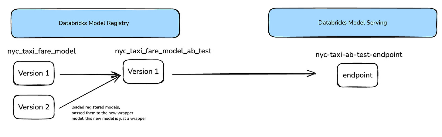 4. Deploy a Serving Endpoint : With the MLflow wrapper model registered, we set up a serving endpoint on Databricks for real-time A/B testing. This endpoint is configured to direct incoming requests to the Pyfunc wrapper model, which applies the A/B test logic.